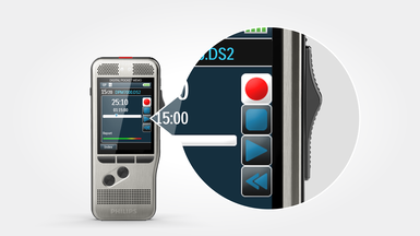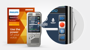 Interruttore a scorrimento a 4 posizioni (registrazione, arresto, riproduzione, riavvolgimento rapido), software di dettatura SpeechExec Basic (abbonamento di 2 anni incluso)